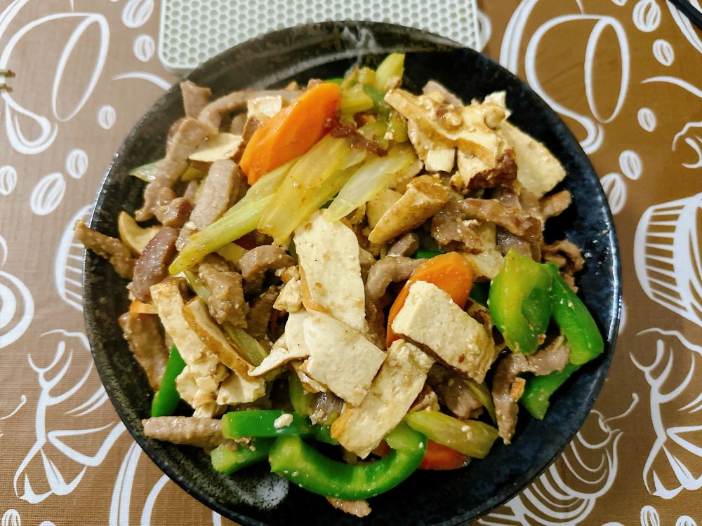上图,蔬菜炒小牛肉,三人份,换算成人民币的食材价格是:豆干30元,青椒11元,小牛肉36元,芹菜17元,胡萝卜6元,合计100元。